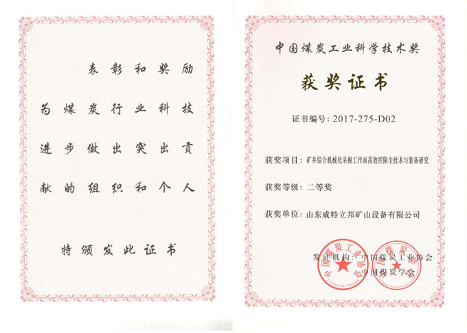 巖巷機械化掘進粉塵污染控制技術及裝備科學技術進步獎
